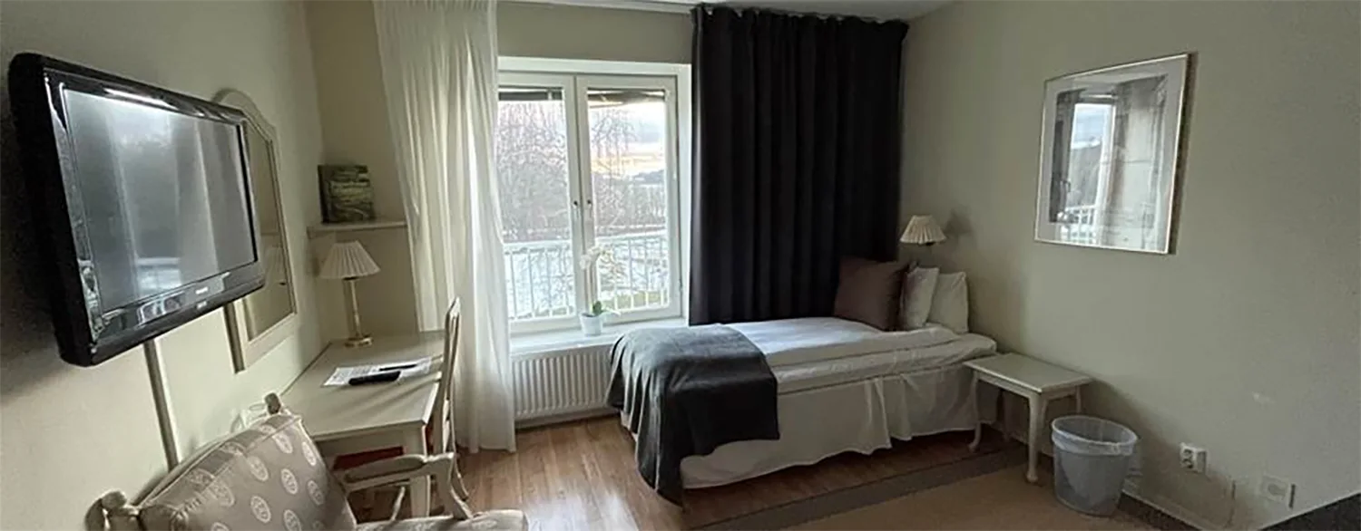 Vårt long stay rum är utrustat med alla nödvändigheter du kan tänkas behöva av en lägenhet. Rummet är ca 16 kvm och hyser en enkelsäng, dusch, WC, kitchenette*, TV och Wifi. Du har nära till egen ingång. Kontakta oss för offert på Long stay-boende, e-post: info@fredensborg.com.